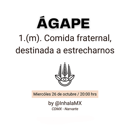 Queremos llevar la experiencia culinaria que hemos desarrollado en INHALA a la Ciudad de México, para seguir abrazando a nuestra comunidad. ÁGAPE es nuestra forma de expandir los encuentros de INHALA con nuestros productos del campo y recetas poco convencionales donde buscaremos sorprender a tu paladar mientras la convivencia inesperada, los momentos compartidos y la plática crean la noche.